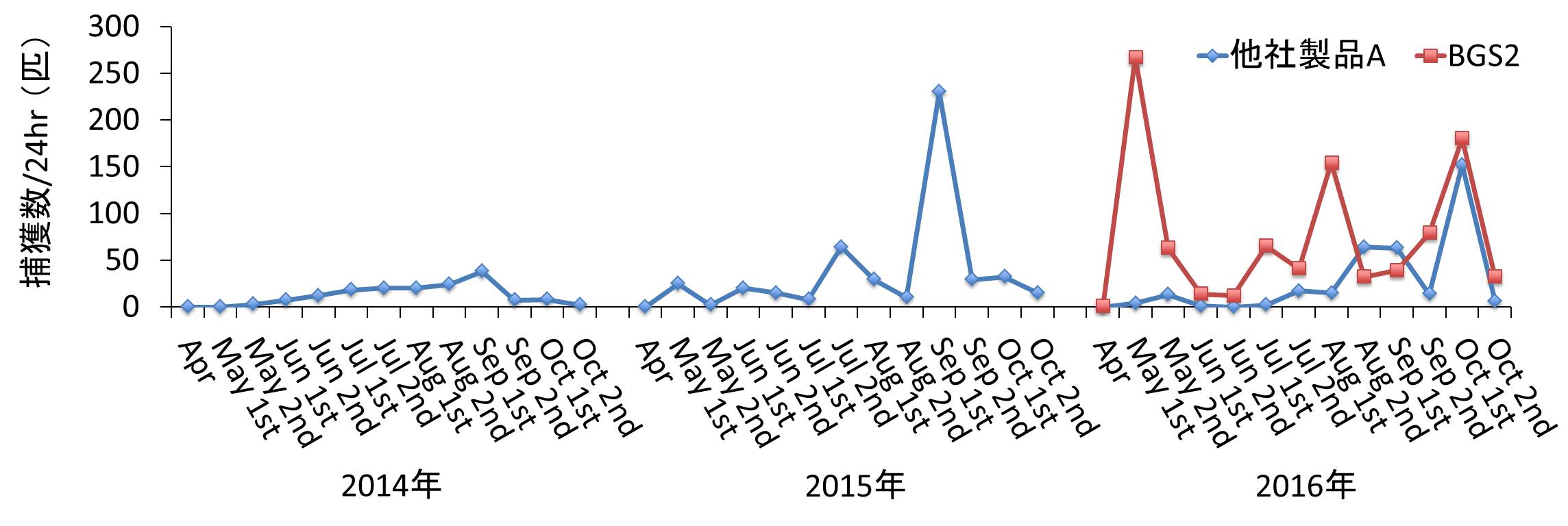 累積捕獲数はBGS2が32匹、他社製品Aが11匹と2.9倍の差となった。この現場ではアカイエカ群は優占種ではないと考えられた。