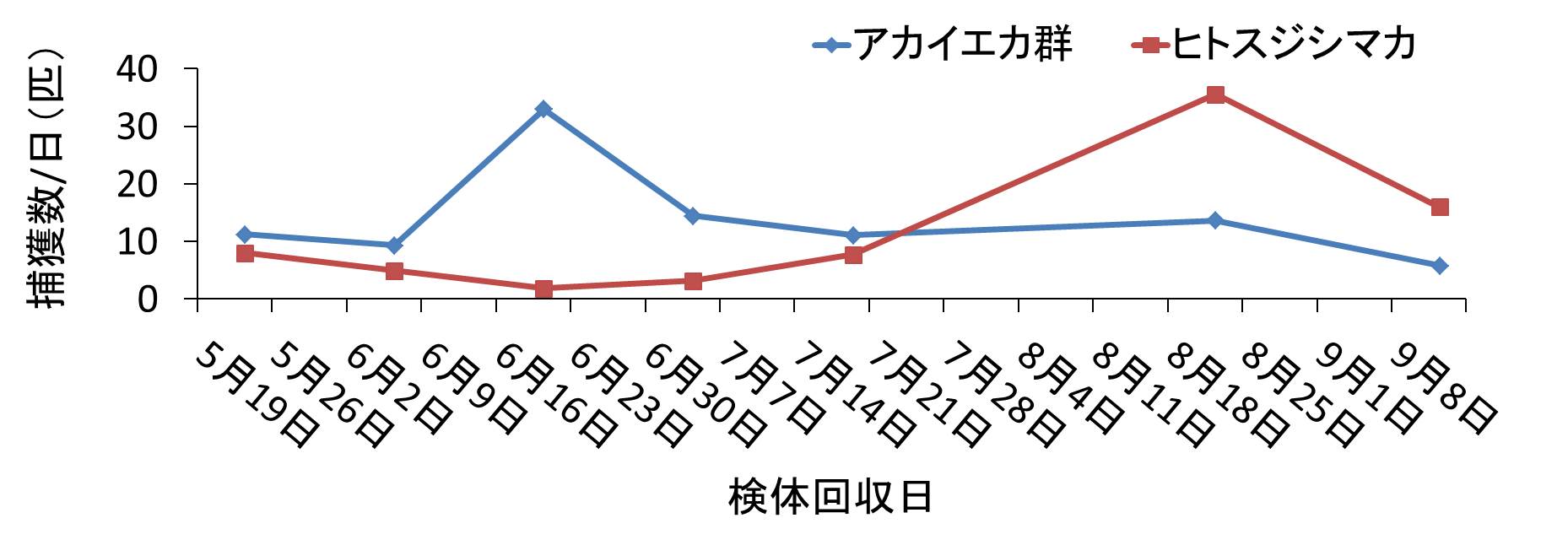 検体の回収は2週間〜1ヶ月ほどの間隔で実施し、1日あたり捕獲数に換算して作図