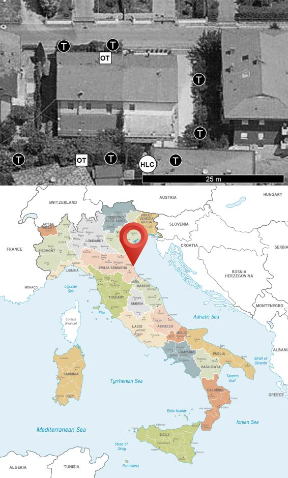 右写真の黒丸TはBGS設置場所、白四角OTはオビトラップ設置場所、HLCは人おとり法実施場所