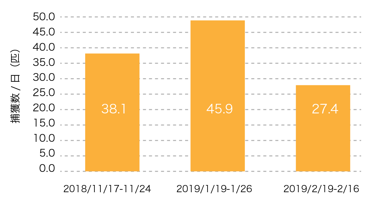 | 1日あたり捕獲数(匹) | 38.1 | 45.9 | 27.4 | 37.1 |